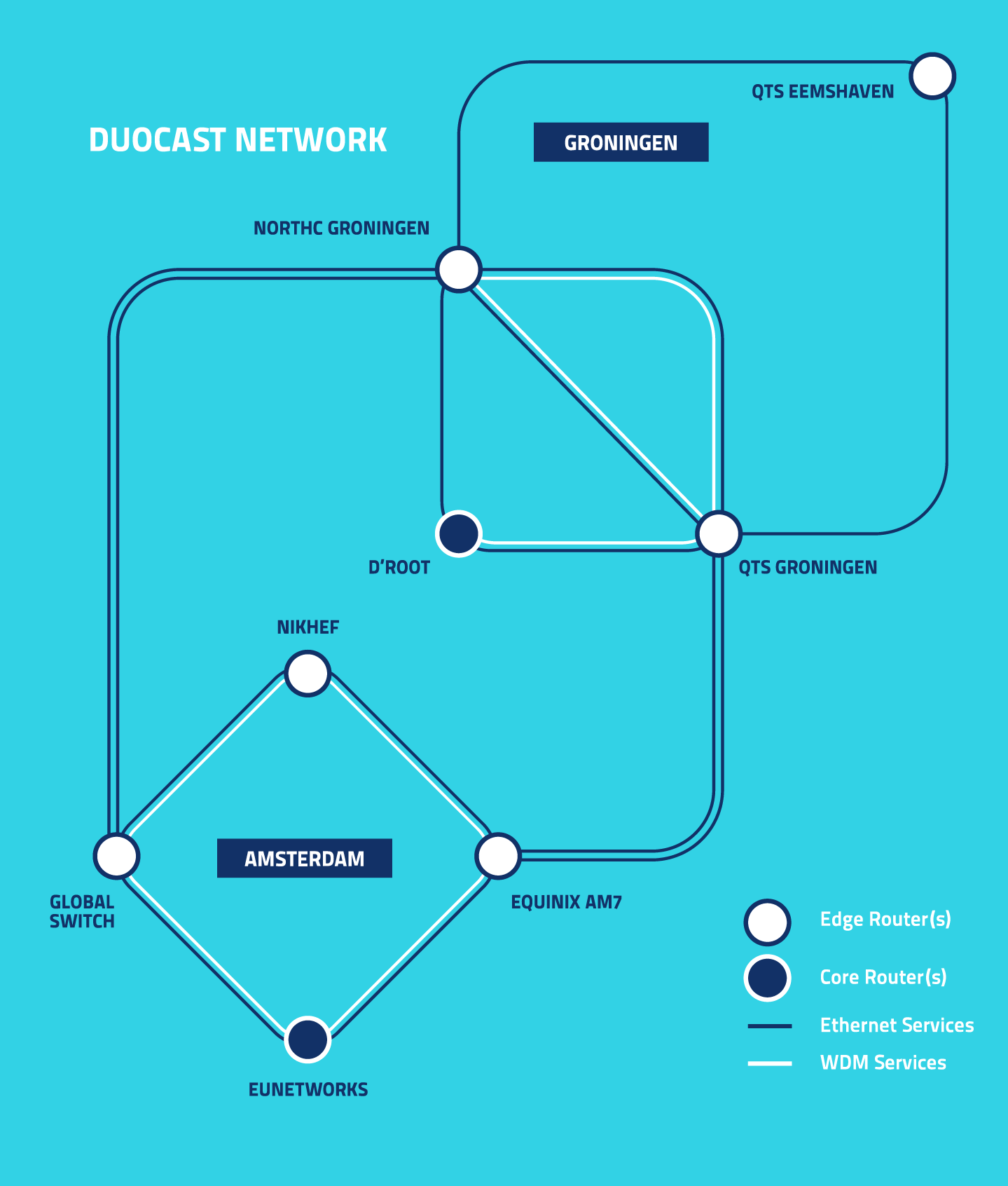 Duocast has a dark fiber ring within the city of Groningen between TCN Datahotel Groningen and the NLDC/KPN datacenter in Westpoort. This connection runs via the data center d’Root in a ring around the city of Groningen, which enables us to guarantee the connection between TCN and NLDC. SAN replication over fiberchannel between TCN Datahotel Groningen and NLDC Westpoort is also possible.