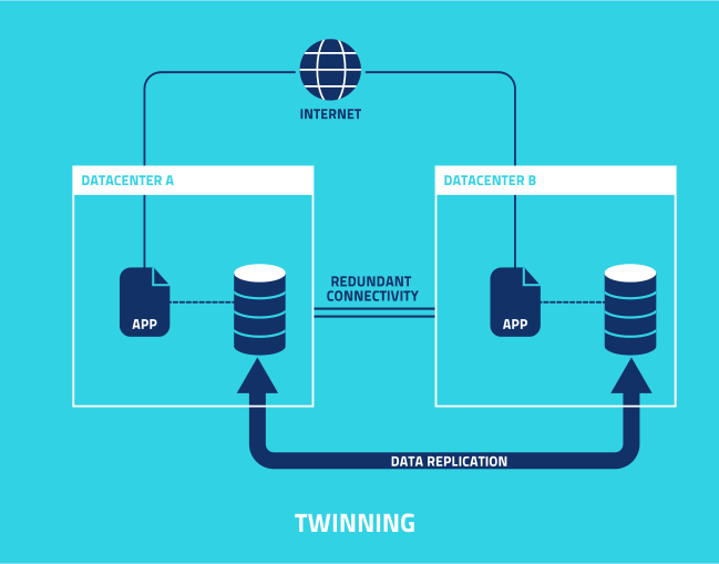 Op twee geografisch gescheiden locaties worden identieke omgevingen ingericht met active/active of active/passive data replicatie.